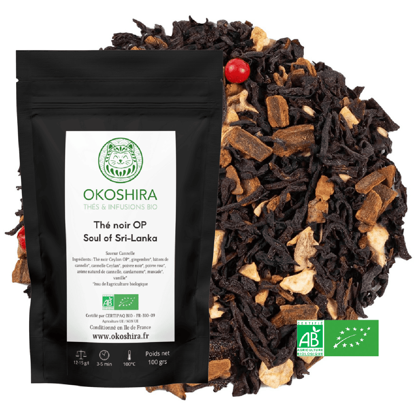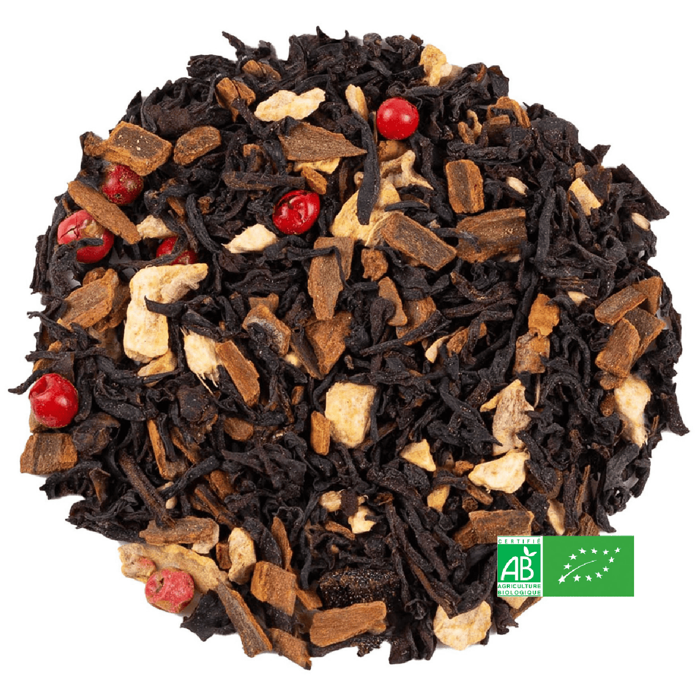 Thé noir Ceylon OP*, bâtons de cannelle*, gingembre*, poivre noir*, poivre rose*, arôme naturel, cardamome*, muscade*, vanille bourbon*
